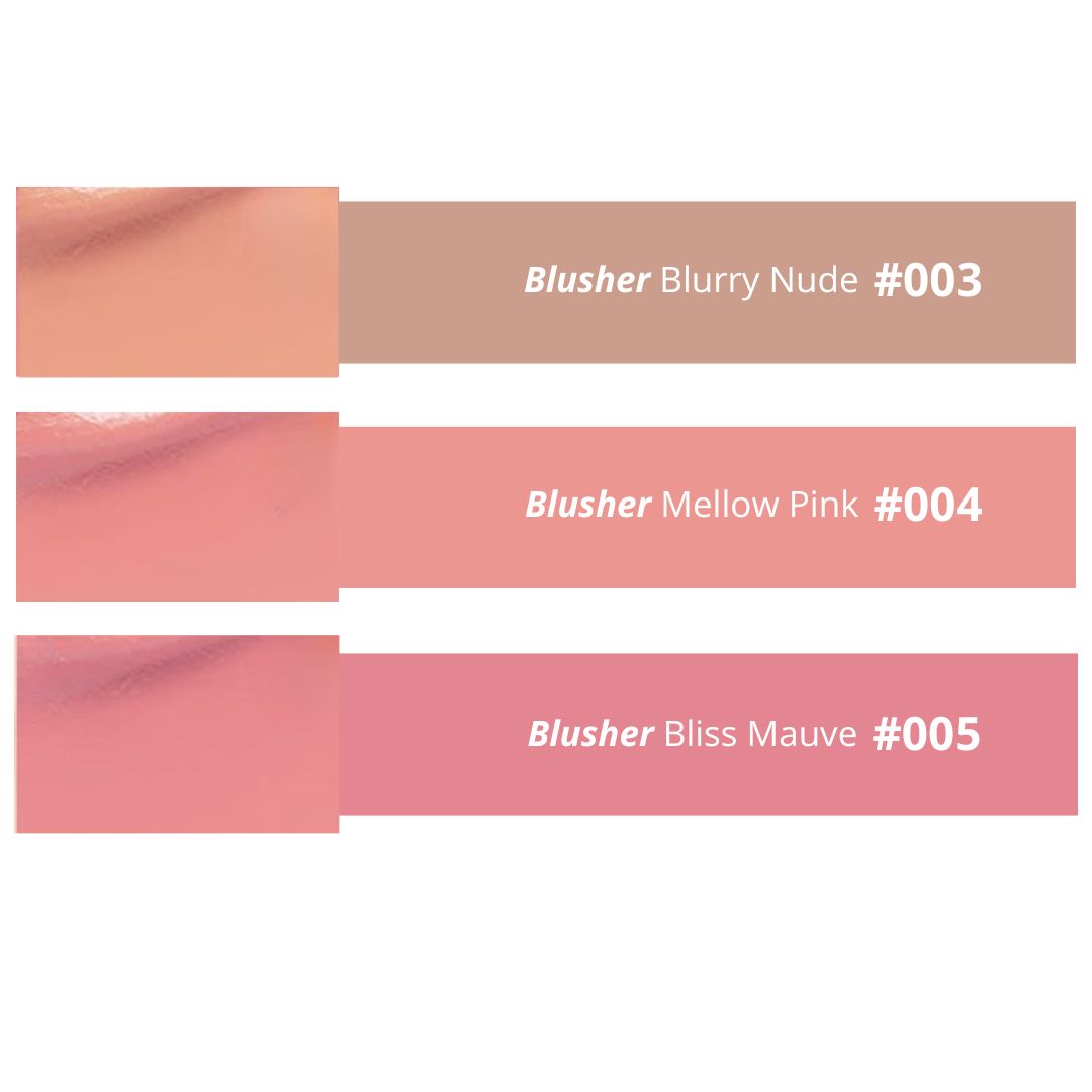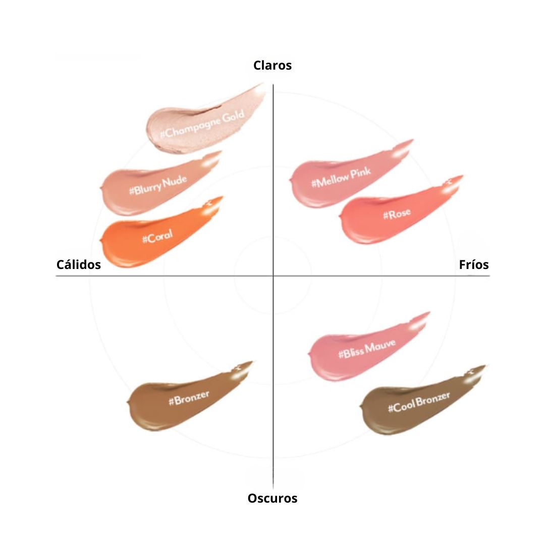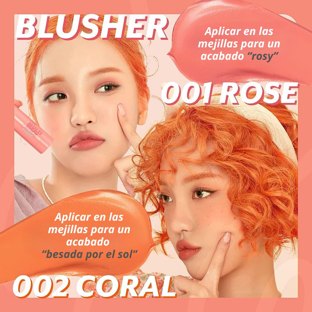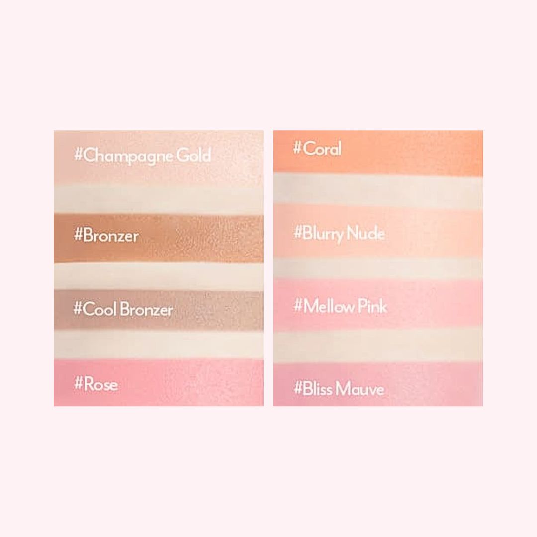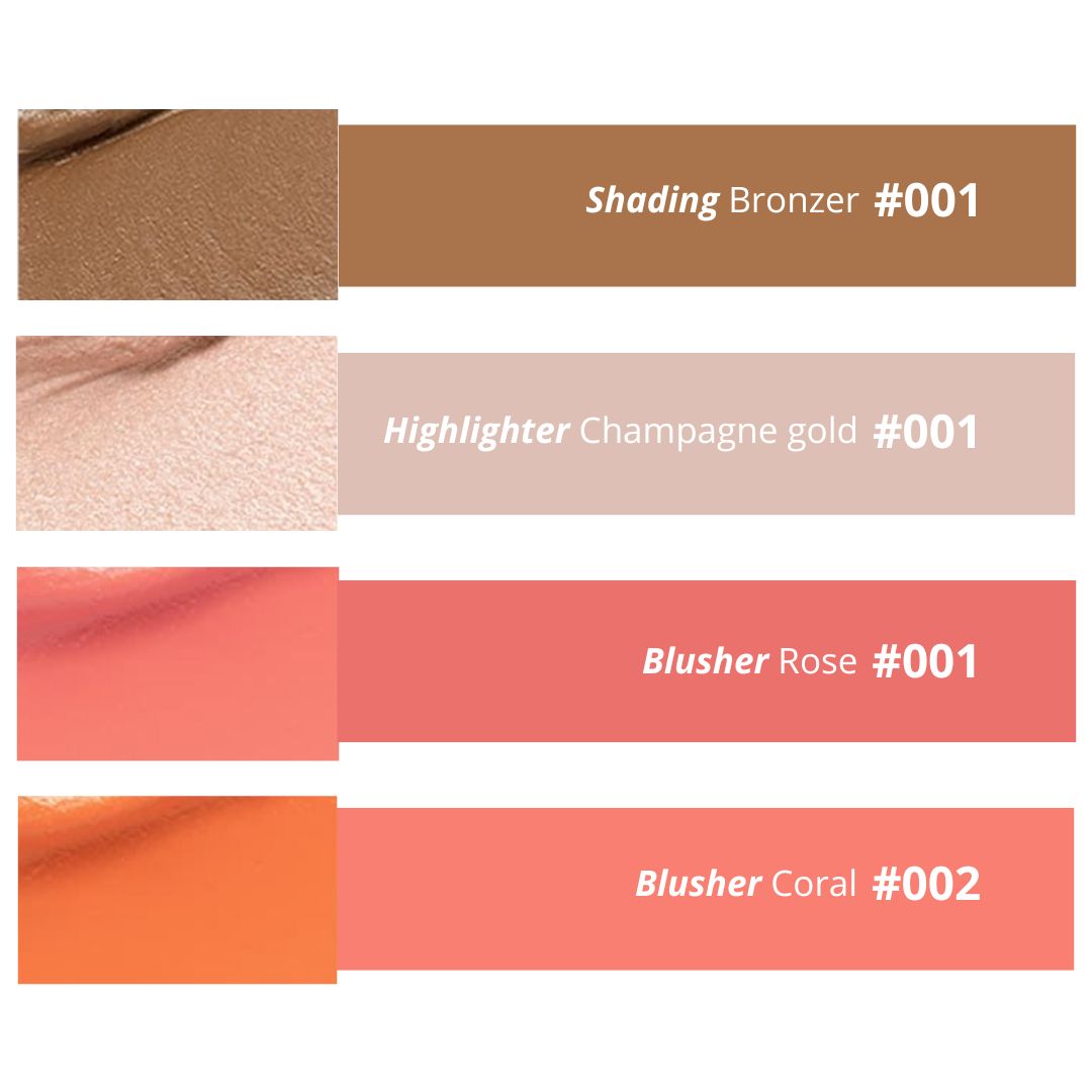El iluminador se puede usar en la frente, los huesos de las cejas, el puente de la nariz y las mejillas para agregar definición a sus rasgos faciales. Disponible en colores rosa y coral, el colorete se puede usar en las mejillas para un brillo saludable.