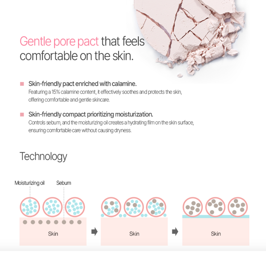 Este pact ayuda a mantener la piel libre de brillo, controlando eficazmente el sebo y el sudor durante todo el día. Con su fórmula refinadora, este compacto minimiza la apariencia de los poros, ofreciendo un acabado impecable. Contiene aceite hidratante y un 15% de calamina, formando una barrera de humedad que protege y calma la piel. Tiene propiedades absorbentes que ayudan a controlar el exceso de sebo en la piel, lo que la hace ideal para pieles grasas y propensas al acné. Adicionalmente enriquecido con extracto de Houttuynia cordata.