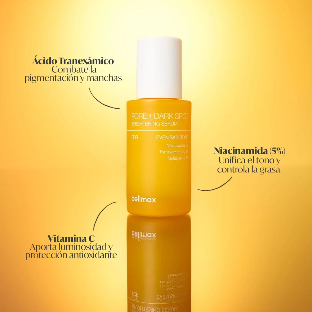 El PORE+DARK SPOT BRIGHTENING SERUM de CELIMAX es un serum iluminador formulado con 3% de ácido tranexámico y 5% de niacinamida que aborda las imperfecciones de la piel, como las manchas oscuras y el tono desigual, para un acabado saludable y radiante.