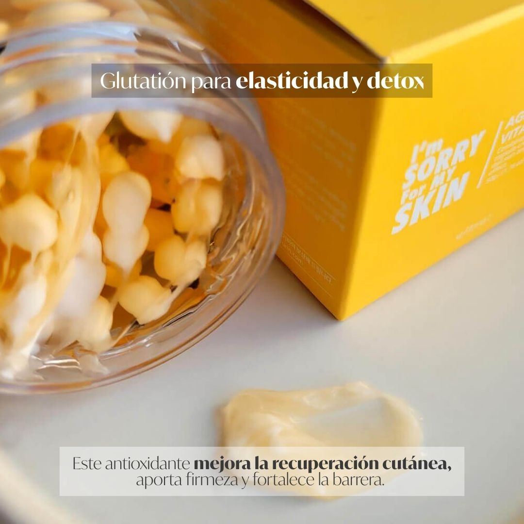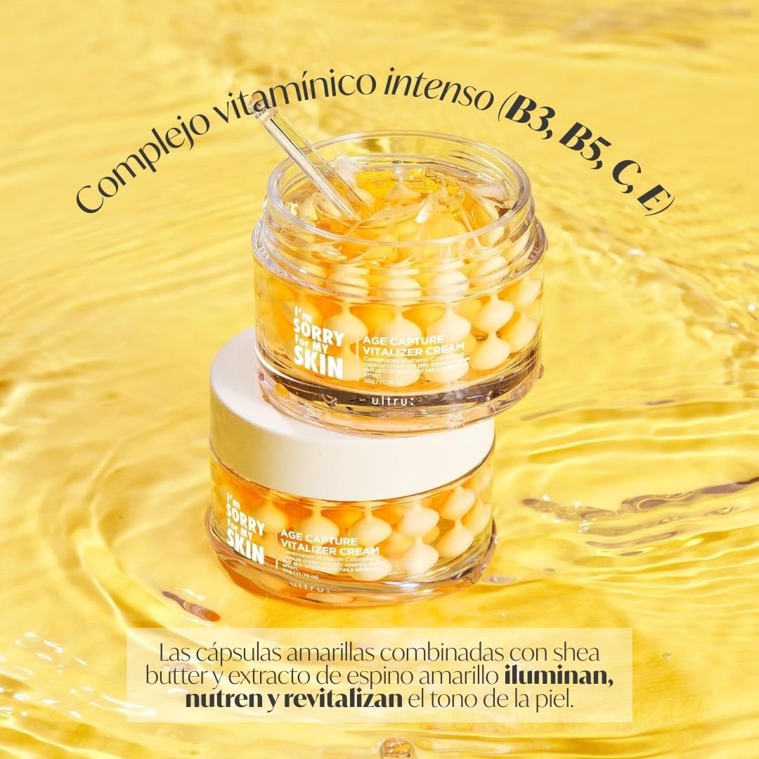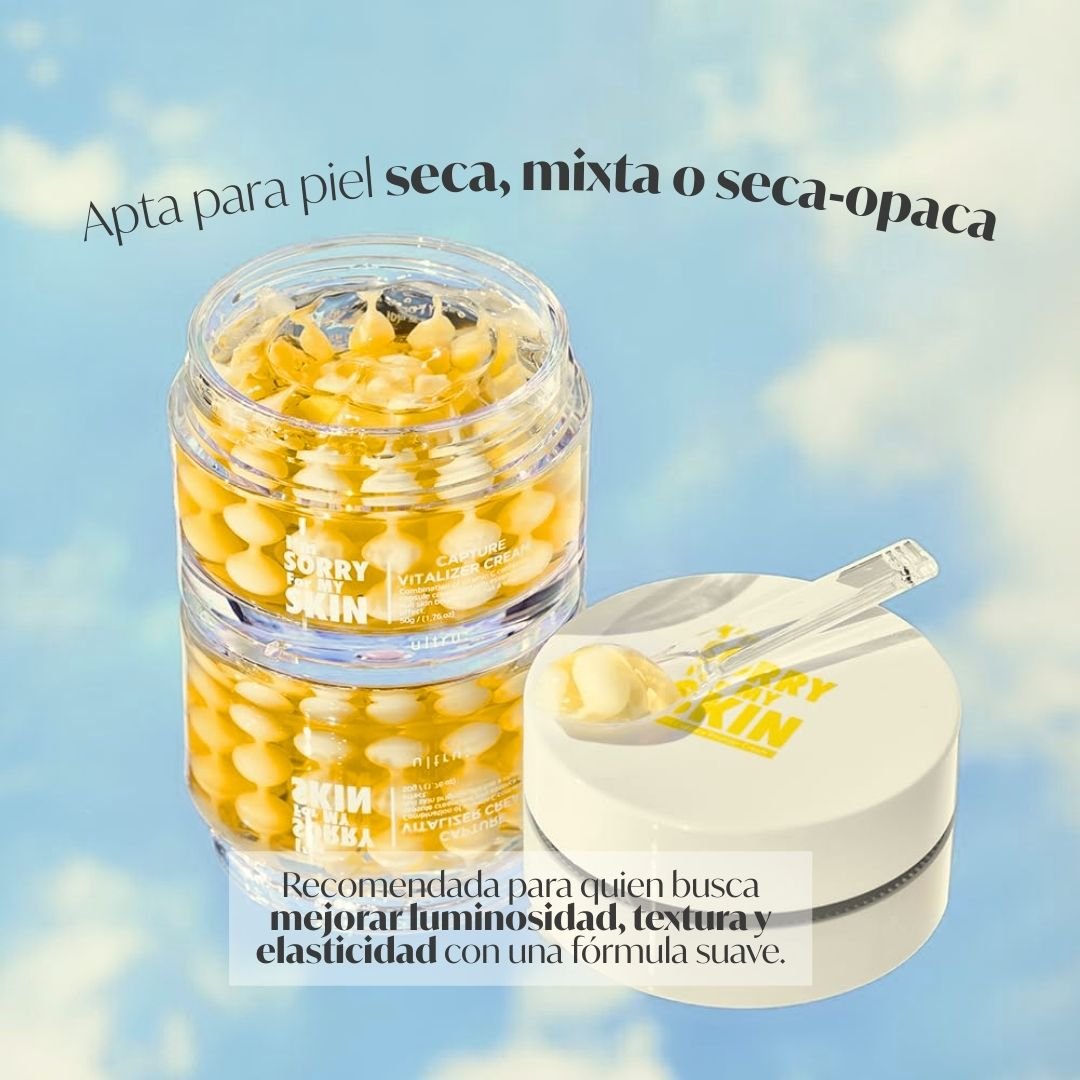 La Capture Vitalizer Cream de I’m Sorry For My Skin está diseñada para devolverle a la piel su energía natural, combatiendo los signos de fatiga y revitalizando el rostro con un acabado saludable y luminoso. Gracias a su fórmula con niacinamida, vitaminas C y E, y glutatión, ayuda a iluminar el tono, aportar firmeza y proteger frente al daño oxidativo.