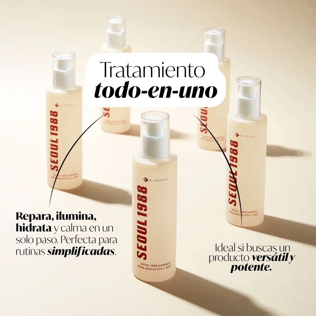 La esencia Snail Mucin 97% + Rice de la linea SEOUL 1988 de K-SECRET es una fórmula concentrada que combina el poder regenerador de la baba de caracol con los beneficios iluminadores y suavizantes del arroz fermentado. Con 970,000 ppm de filtrado de baba de caracol, este producto ayuda a reparar la barrera cutánea, reducir líneas finas y mejorar visiblemente la textura de la piel.