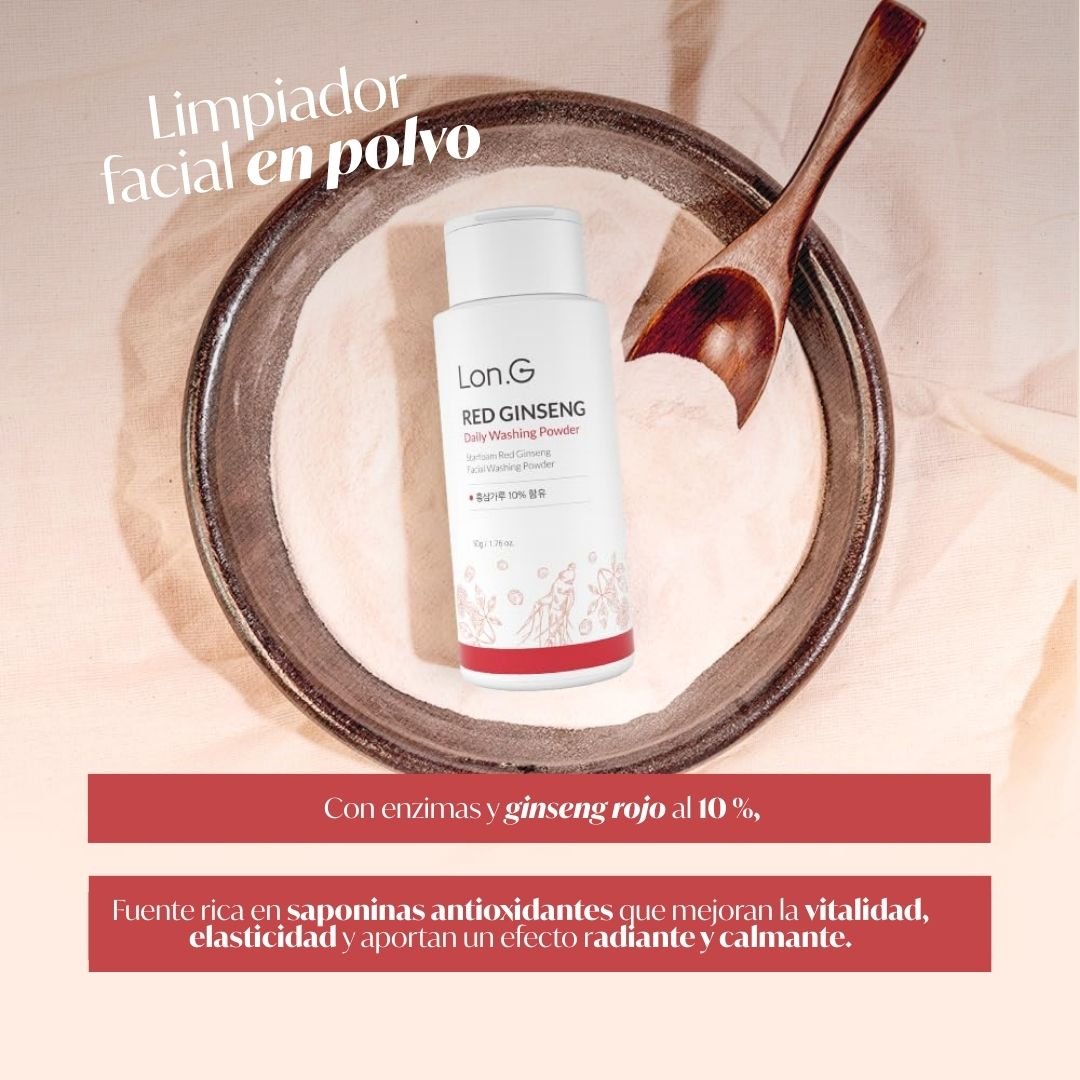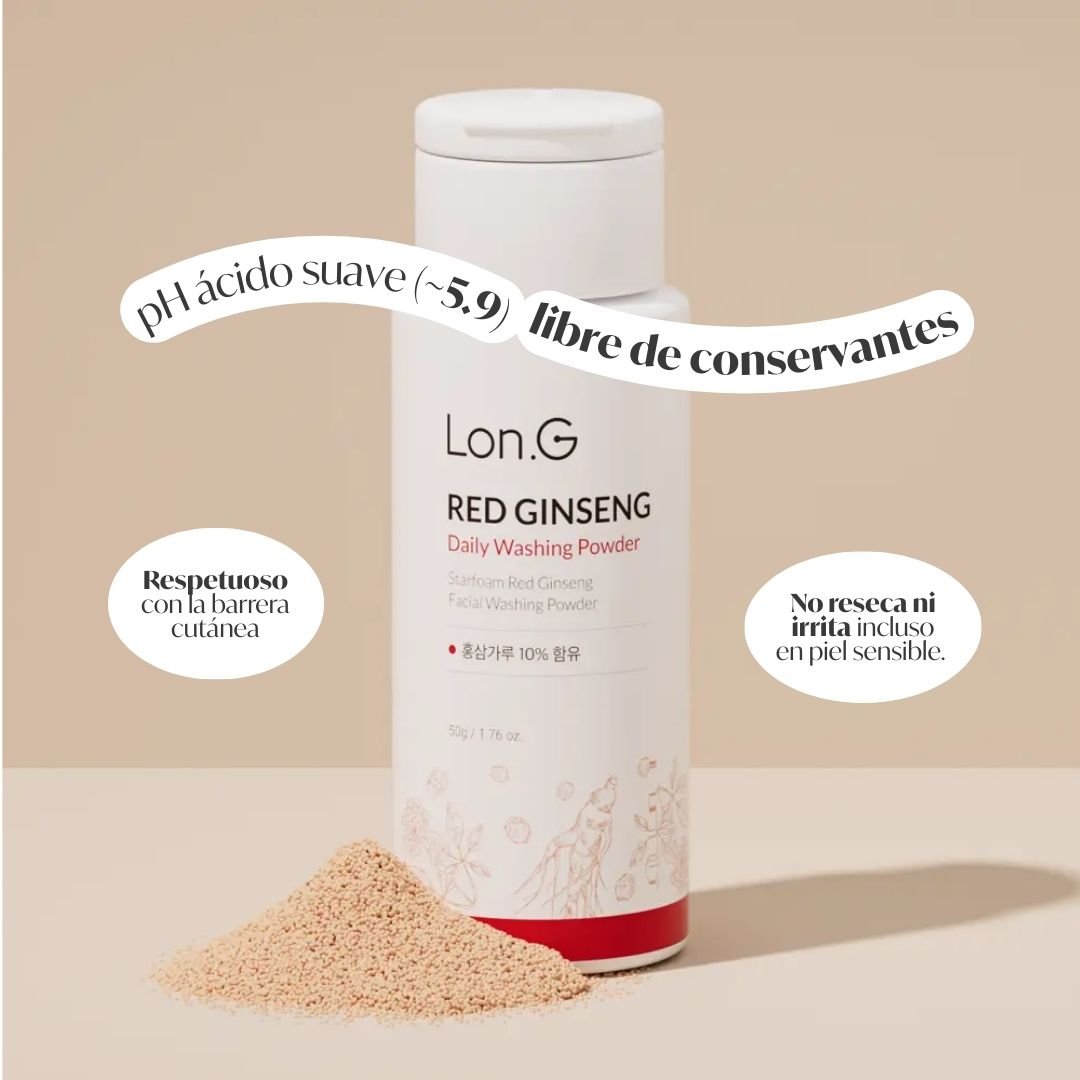 El Starfoam Red Ginseng Facial Washing Powder es un limpiador facial en polvo que, al contacto con el agua, se transforma en una espuma suave y cremosa. Su fórmula combina tensioactivos suaves derivados de aminoácidos con extracto en polvo de ginseng rojo coreano, aportando una limpieza efectiva sin resecar la piel.