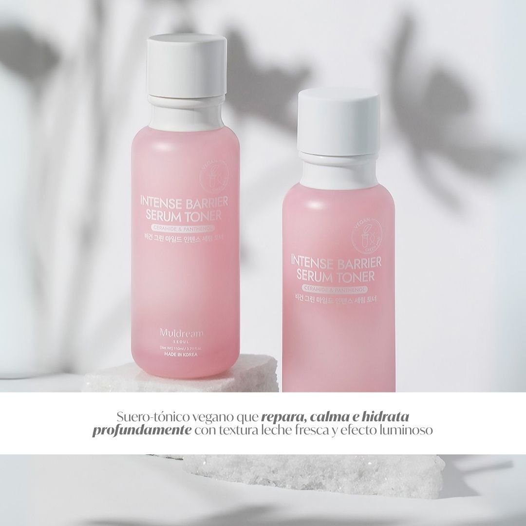 El Vegan Green Mild Intense Serum Toner de Muldream es un serum tónico diseñado para ofrecer hidratación profunda, calma y nutrición desde el primer paso de la rutina. Su fórmula vegana combina extractos calmantes, aceites nutritivos y activos restauradores, lo que lo convierte en un tratamiento multifuncional ideal para pieles sensibles o deshidratadas.